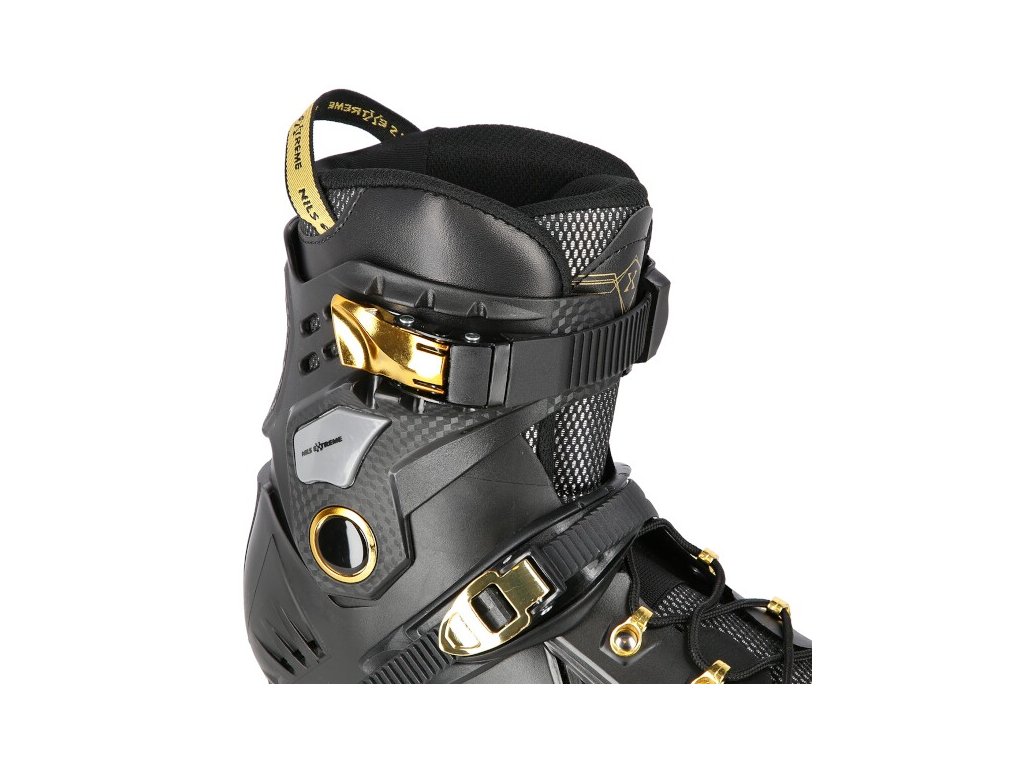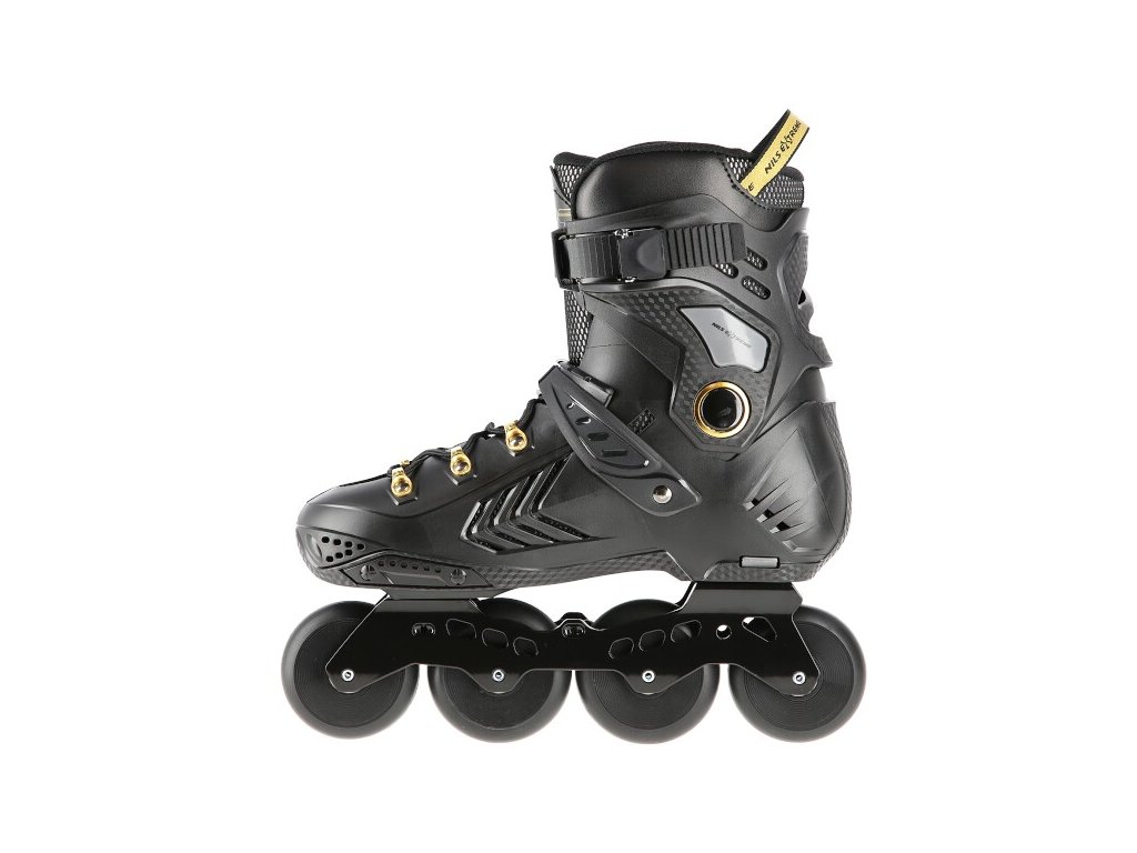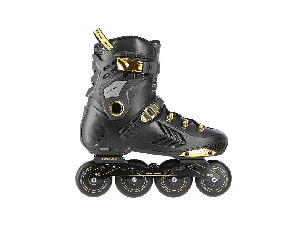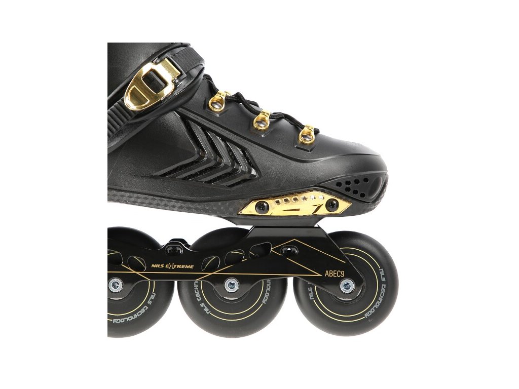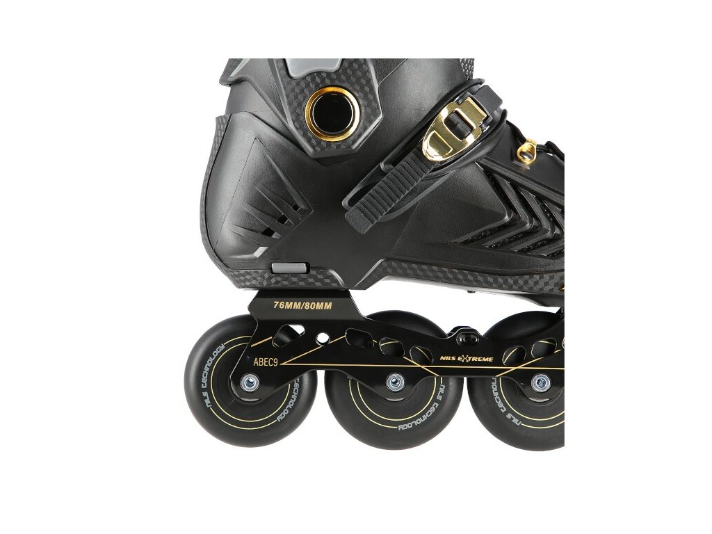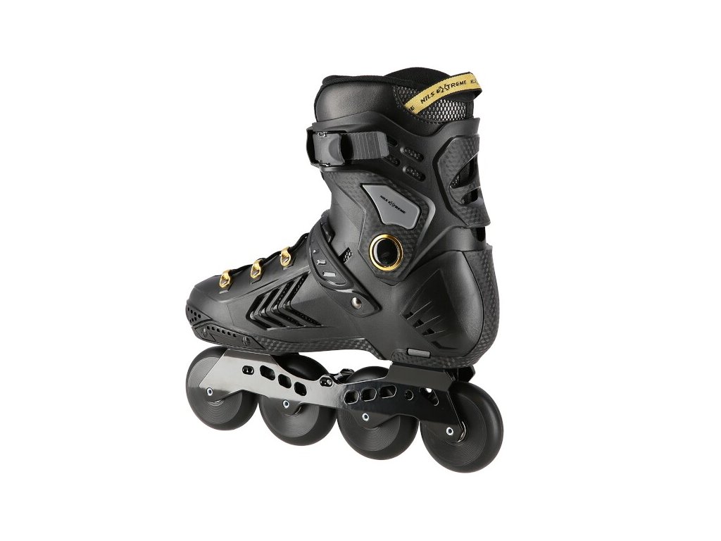 Kolečkové brusle NILS Extreme NA20002 jsou určeny primárně pro freeride a slalom. Jejich konstrukce je založena na lehké, větrané botě s anatomickou stélkou zaručující vysokou stabilitu paty, polypropylenovém skeletu a hliníkové liště vyrobené pomocí vstřikování. Jako zapínání bylo použito šněrování, dvojsekční přezky a kvalitní spony s napínacím mechanismem. Na vnější straně boty nalezneme slider, tak často užívaný při freeridu.