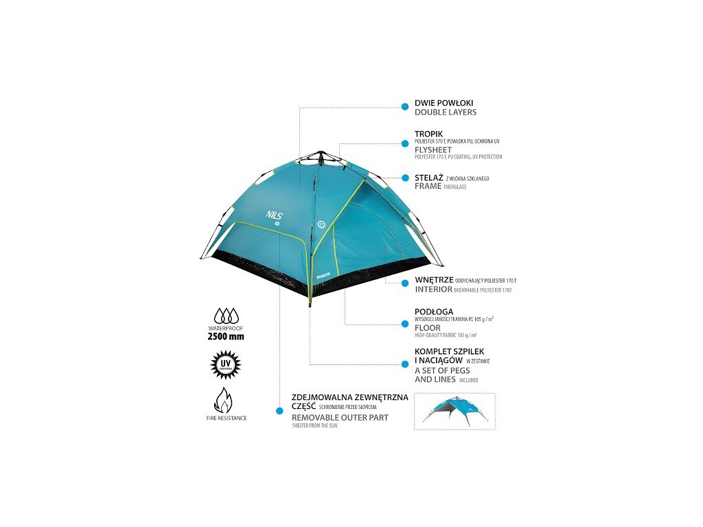 - Materiál tropika a horní části ložnice: polyester 190T, polyuretanový zátěr, voděodolnost 3000 mm H2O