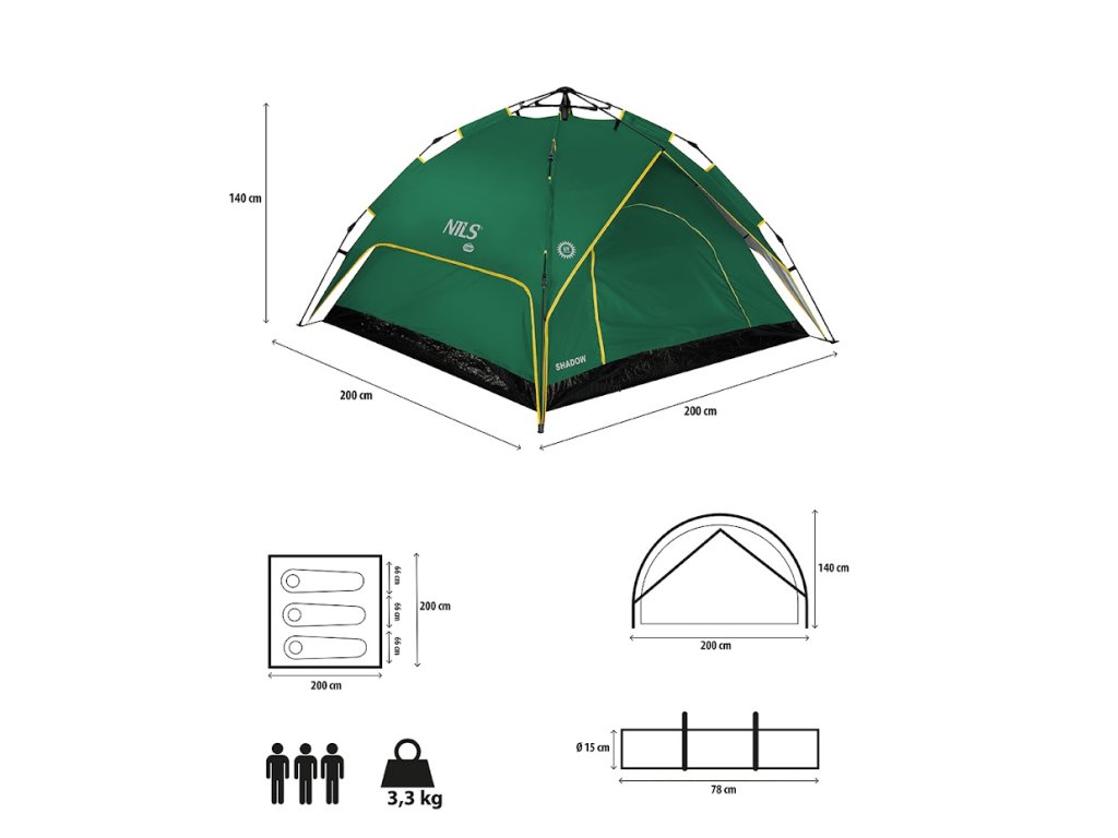 NILS Camp NC7819 Shadow je 3 osobový stan, který oceníte při toulkách přírodou, spaní pod "širákem" a nebo při krátkém pobytu v kempu. Odnímatelné tropiko lze využít jako přístřešek, který vás ochrání před deštěm a nebo sluncem. Automatická skládací konstrukce zajišťuje rychlé složení a rozložení stanu.