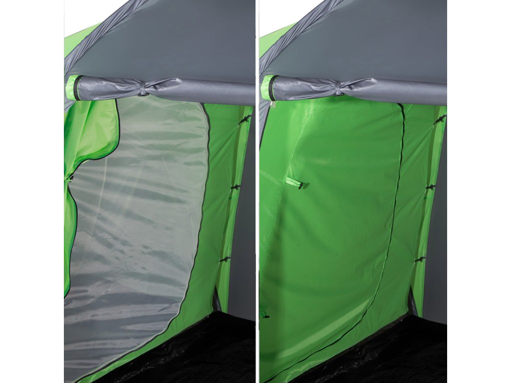 Highland nabízí dvě samostatné ložnice, každou pro tři osoby, a velkou předsíň o rozměrech 210 × 210 × 200 cm. To je dostatek prostoru k pohodlnému pobytu uvnitř stanu – ať už odpočíváte, nebo se schováváte před deštěm.