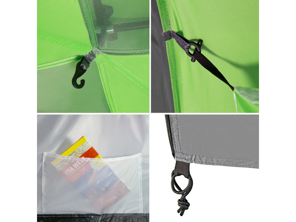Čtyři vnitřní kapsy umožňují udržet pořádek a mít po ruce nezbytné věci. Háček pod stropem v každé ložnici slouží k zavěšení svítilny. A speciální podlaha v předsíni s odnímatelným prahem účinně zabraňuje pronikání písku, prachu a bláta dovnitř, zároveň usnadňuje čištění interiéru.