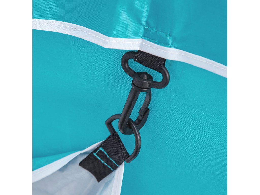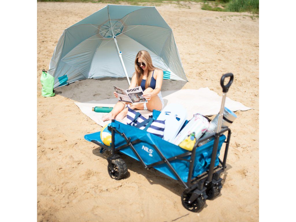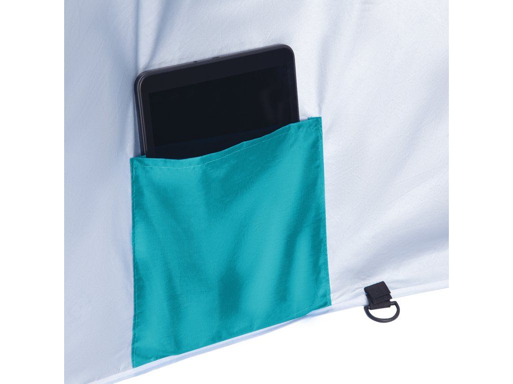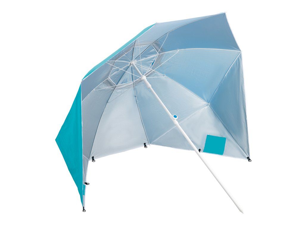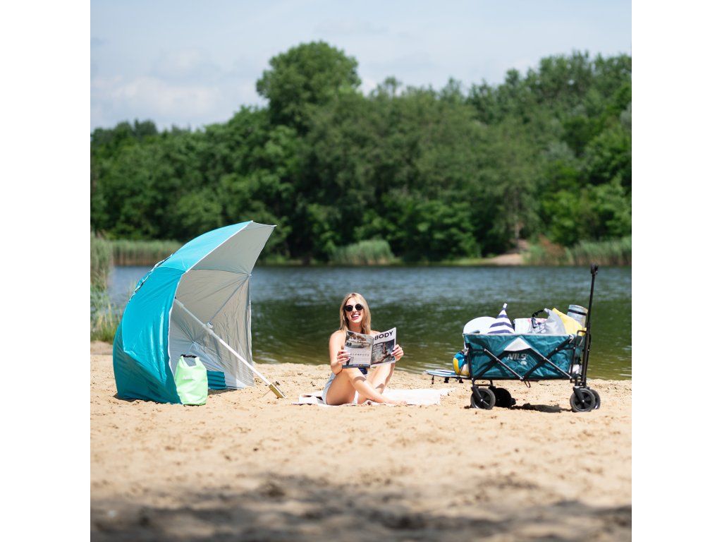 Plážový slunečník s možností použití jako plážová zástěna, to je NILS Camp NC7822. Slunečník je ideálním parťákem během slunečného odpoledne na pláži a nebo na zahradě. NC7822 se snadno přenáší díky dodávanému vaku s poutkem přes rameno. Spodní tyč je osazena špičkou pro snadné zapíchnutí do podkladu. Polyesterová plachta má průměr 190 centimetrů a dokonale chrání před slunečním svitem a škodlivým UV zařením. Na 2 protilehlých stranách se nachází bočnice o šířce 75 centimetrů, které se použijí při položení slunečníku na podklad a slouží jako okraje plážové zástěny, ta se zajistí k podkladu pomocí 4 dodávaných kolíků. Pokud NC7822 používáme jako slunečník, můžeme bočnice pomocí plastových karabinek připnout k vrchlíku, aby nám nepřekážely.