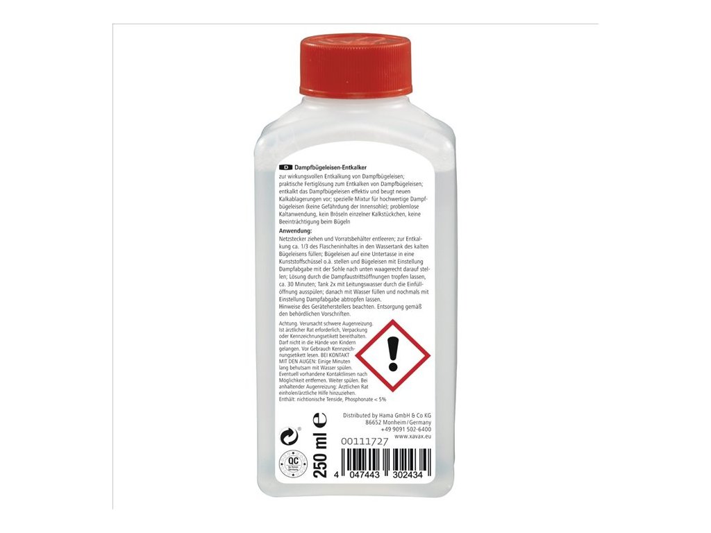 Čisticí prostředek Xavax o objemu 250 ml snadno a rychle odvápní napařovací žehličky. Odstraňuje vodní kámen a zároveň působí jako prevence nových usazenin vodního kamene. Speciální směs vhodná také pro vysoce kvalitní napařovací žehličky (nepoškozuje vnitřní plášť žehličky). Bezproblémové použití za studena, zbytky vodního kamene se rozpustí a nezpůsobují znečištění prádla/oblečení během žehlení.