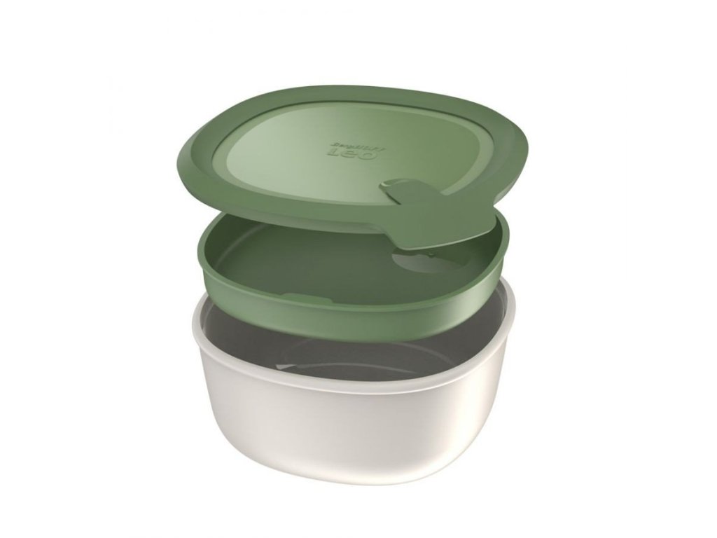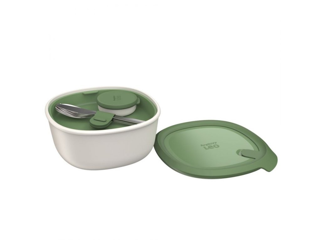 Velmi praktická sada salátové mísy s víkem a příborem od belgické značky BergHOFF.Slouží ke skladování a především přenos nejrůznějších druhů potravin i hotových pokrmů. Vyrobená z odolného BPA Free plastu. Díky tomu ji můžete bez problému použít v mikrovlnné troubě i v mrazáku. Dóza má vlastní těsnící víčko, které neprotéká. Součástí sady je také menší dózička na různé ingredience či dresing a příbor z nerezové oceli. Jednoduché čištění, všechny dózy navíc můžete dát do myčky nádobí.