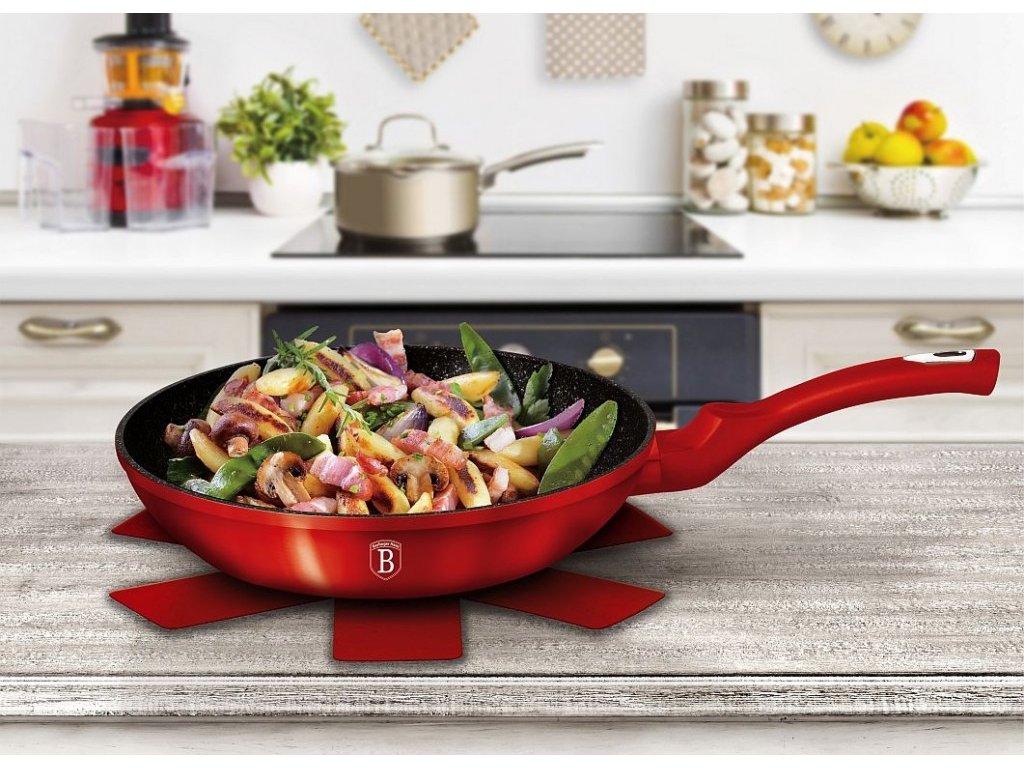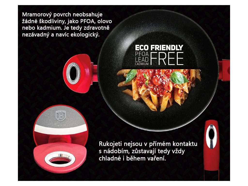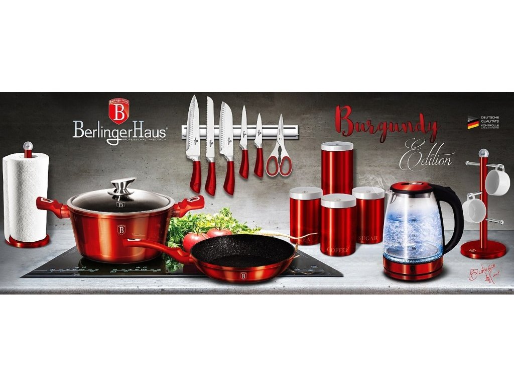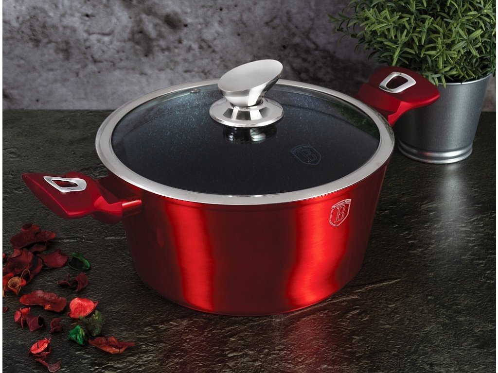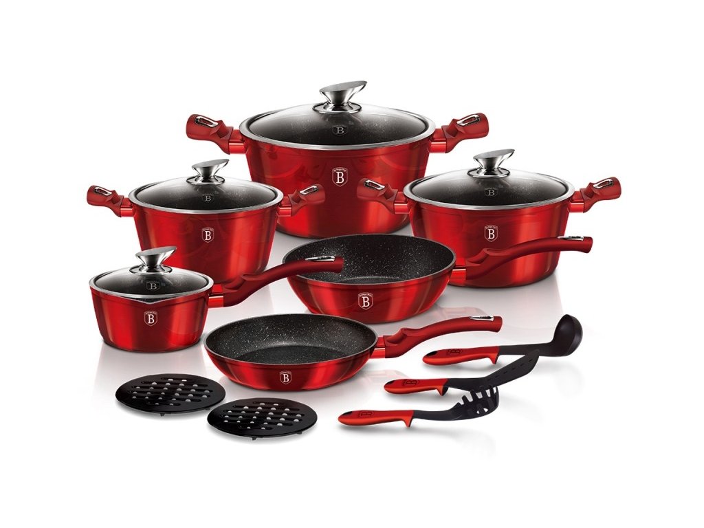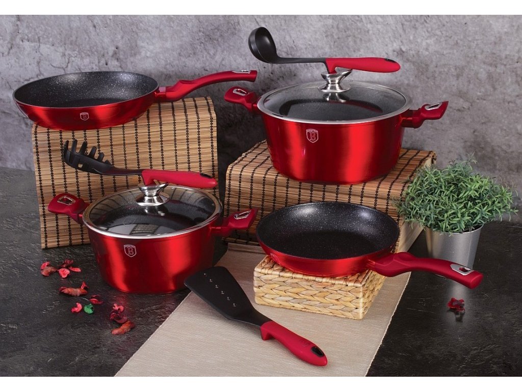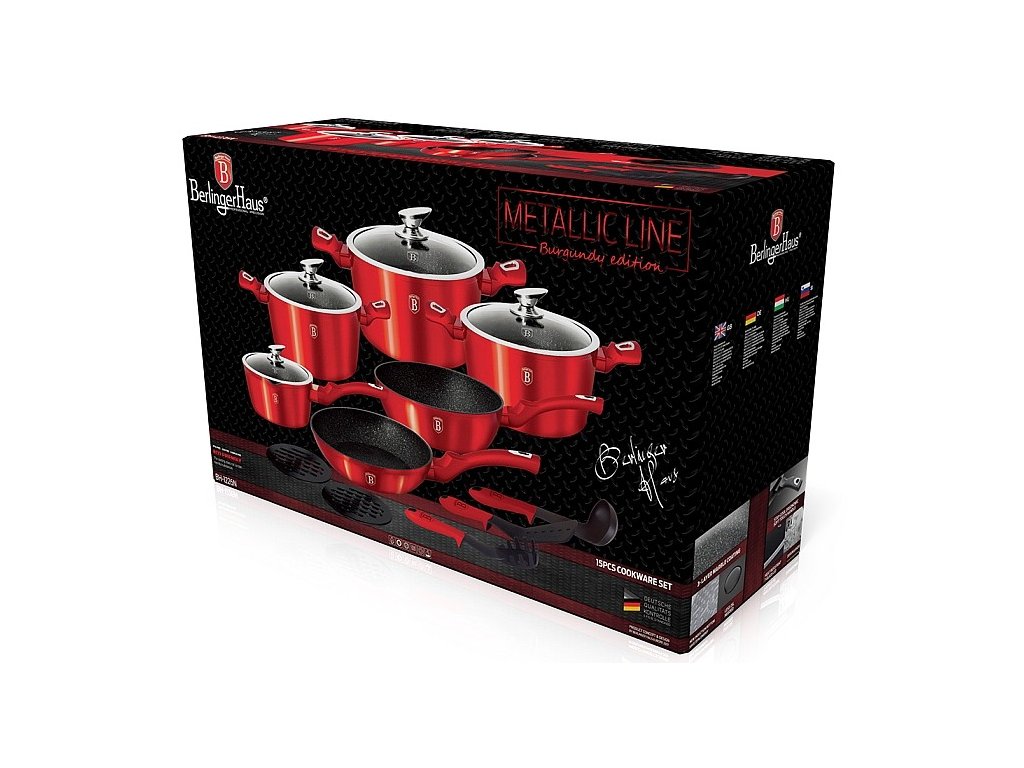 Krásná sada nádobí značky Berlingerhaus edice Burgundy Metallic Line se skládá celkem ze 15 kusů nádobí a kuchyňského náčiní. Nádobí v elegantním designu má 3vrstvý mramorový povrch, který je charakteristický svou dokonalou nepřilnavostí. Připravované potraviny se nepřipalují a díky tomu se nádobí velmi jednoduše čistí. Zároveň je vhodný pro zdravé vaření s minimem tuku nebo oleje a můžete uspořit až 35 % energie a času oproti obyčejným nerezovým kastrolům.
