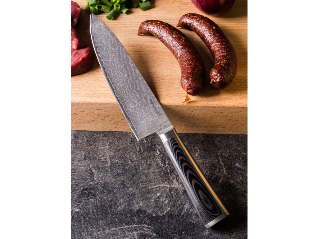 Sada nožů z damaškové oceli v kuchyni jsou skvělou volbou. Damascénská ocel má vyšší tvrdost a odolnost vůči opotřebení, díky vzácné a unikátní kresbě oceli navíc získáte jedinečnou kombinaci krásy a luxusu s vynikajícími řeznými vlastnostmi. V sadě najdete nůž šéfkuchaře a krájecí nůž s délkou 20 cm a jeden univerzální nůž s čepelí o délce 9 cm.