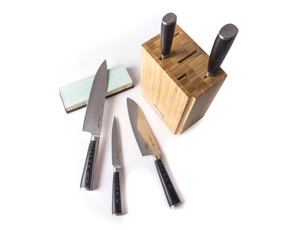 Sada nožů z damaškové oceli v kuchyni jsou skvělou volbou. Damascénská ocel má vyšší tvrdost a odolnost vůči opotřebení, díky vzácné a unikátní kresbě oceli navíc získáte jedinečnou kombinaci krásy a luxusu s vynikajícími řeznými vlastnostmi. V sadě najdete nůž šéfkuchaře a krájecí nůž s délkou 20 cm, Santoku nůž 17 cm a dva univerzální nože s čepelí o délce 9 a 13 cm, dále pak bambusový blok pro bezpečné ukládání nožů a brusný kámen se zrnitostí 1000/3000.