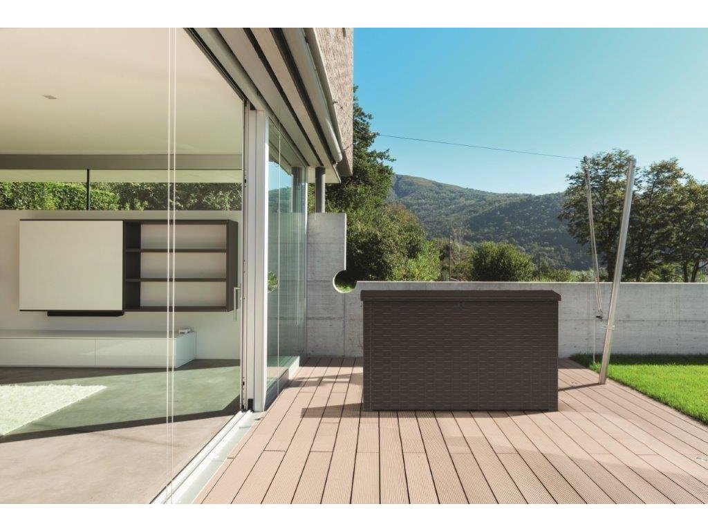 Složení skříně zvládnete během krátké chvíle bez použití jakéhokoliv nářadí. Zahradní box je vyrobený z vysoce kvalitního materiálu. Imituje dřevo a jeho strukturu, v kombinaci s hnědou barvou představuje velmi moderní design.