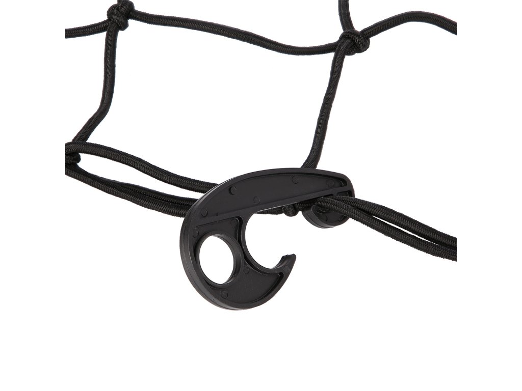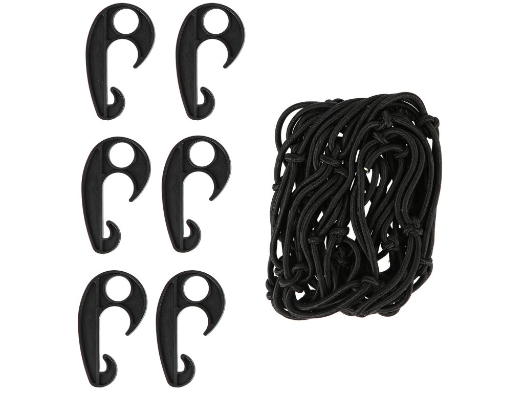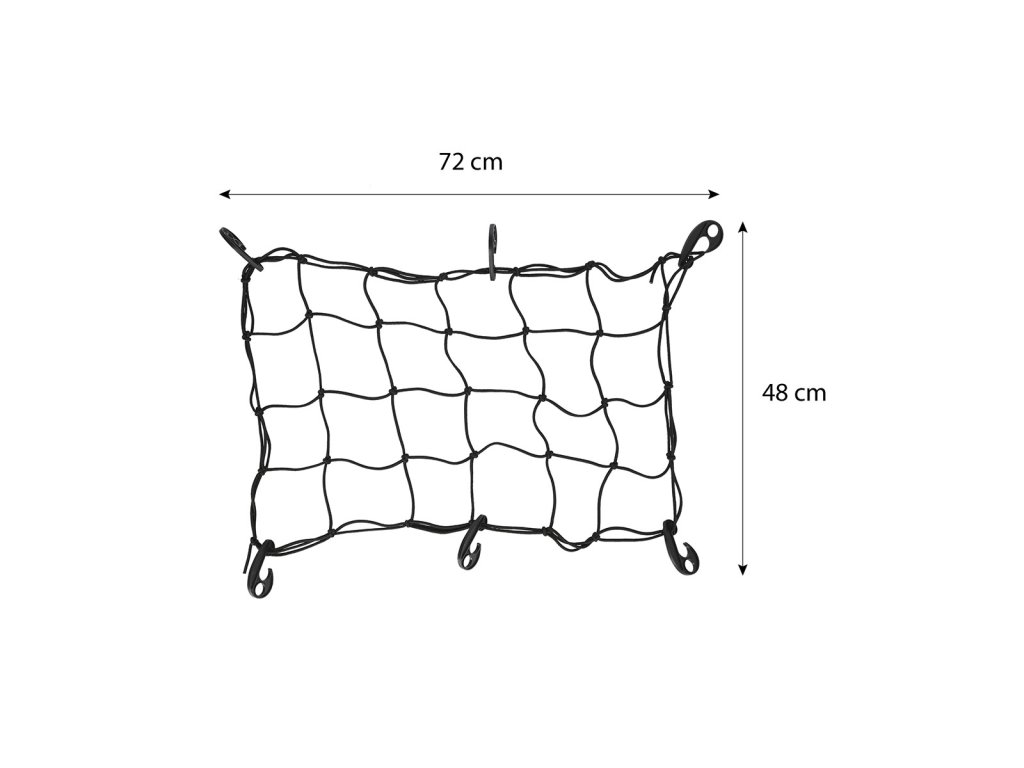 Síť má rozměry 72 x 48 centimetrů a lze ji natáhnout do rozměru 135 x 75 cm. Rozměry ok jsou 12 x 12 cm. Součástí balení je 6 plastových háčků, pomocí kterých lze síťku snadno a rychle upevnit.