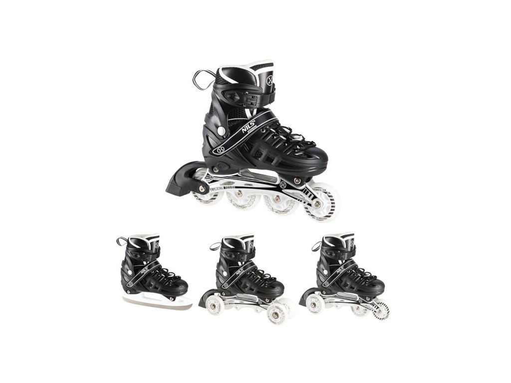 Brusle NILS Extreme NH10905 jsou multifunkční model, který nabízí hned 4 možnosti sestavení podvozku – jako brusle na led, in-line brusle, taneční (quad) brusle a pro nejmenší kombinaci 2+1+1 + nůž na led. Díky tomu jde o univerzální řešení, které se přizpůsobí věku i dovednostem uživatele a poskytne radost z jízdy po celý rok.