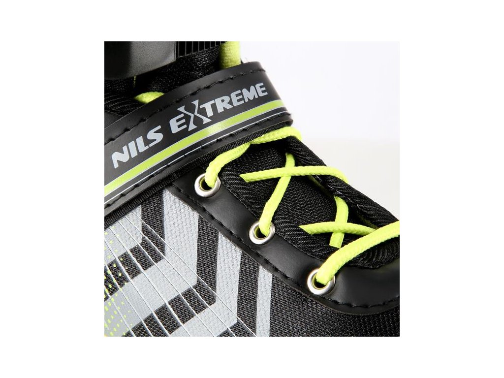 NILS Extreme NH18192 jsou kolečkové brusle 4v1 s vyměnitelným nožem na led, které jsou určeny pro začínající a středně pokročilé uživatele. Hliníkový podvozek je osazen měkkými PU kolečky s ložisky ABEC7 pro svižnou jízdu. Vnější bota je pomocí stisku tlačítka nastavitelná do čtyř velikostí, toto řešení umožňuje precizní přizpůsobení velikosti podle aktuálních potřeb anebo se používá jako "rostoucí bota", která "roste" spolu s nohou dítěte. Na špičce jsou ventilační otvory pro maximální prodyšnost. Vnitřní bota je vyrobena z kombinace semiše, síťoviny MESH, EVA a pěny o vysoké hustotě. Zapínání je řešenou klasickou trojkombinací - šněrování, řemínek se suchým zipem a dvousekční přezka. Součástí balení je sada šroubů a podložek pro přestavbu podvozku do konfigurace 2+1 a 2+2 a pár nožů na led, které jsou vyrobeny z nerez oceli s vysokým podílem uhlíku.