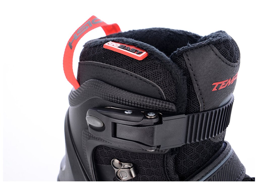 Fixace nohy je doplněna stahovacím páskem v 45° úhlu k nártu na suchý zip a přezkou s páskem v oblasti holeně. Velmi příjemný vnitřní materiál „short fine fur“ pro lepší tepelnou izolaci a pohodlné nazouvání a vyzouvání.